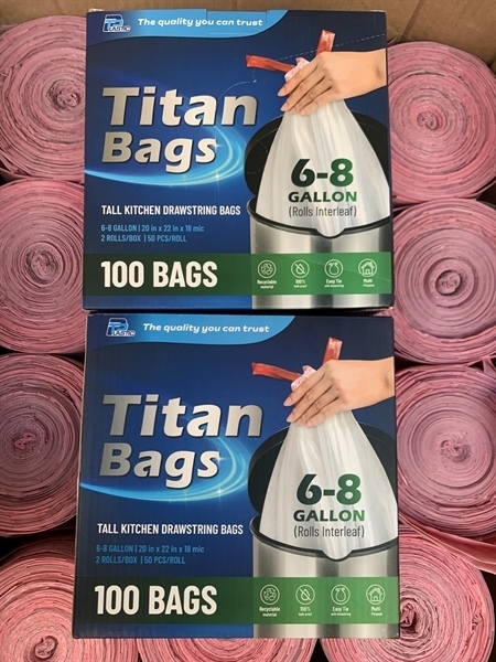 Hộp 2 cuộn 50 Túi rác dây rút Interleaf Titan Bags (20in x 22in x 18mic) – Giải pháp tiện lợi và vệ sinh cho nhu cầu đựng rác hằng ngày. Túi làm từ nhựa PE/HDPE chất lượng cao, dày dặn với độ dày 18 mic, chống rò rỉ và chịu lực tốt. Thiết kế dây rút chắc chắn giúp buộc kín nhanh, ngăn mùi hiệu quả và dễ dàng vận chuyển.